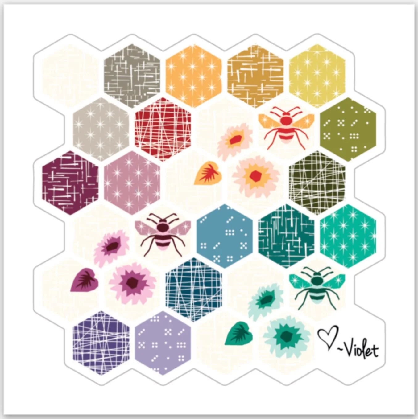 The Honeycomb Abstractions Quilt is a vibrant play on the backyard honeycomb surrounded by colors and flowers and joy. The quilt is easily adjusted in size by adding or removing columns and rows. The entire quilt (blocks and background and sashing) are foundation paper pieced and assembled in columns enhancing the geometric order of nature.